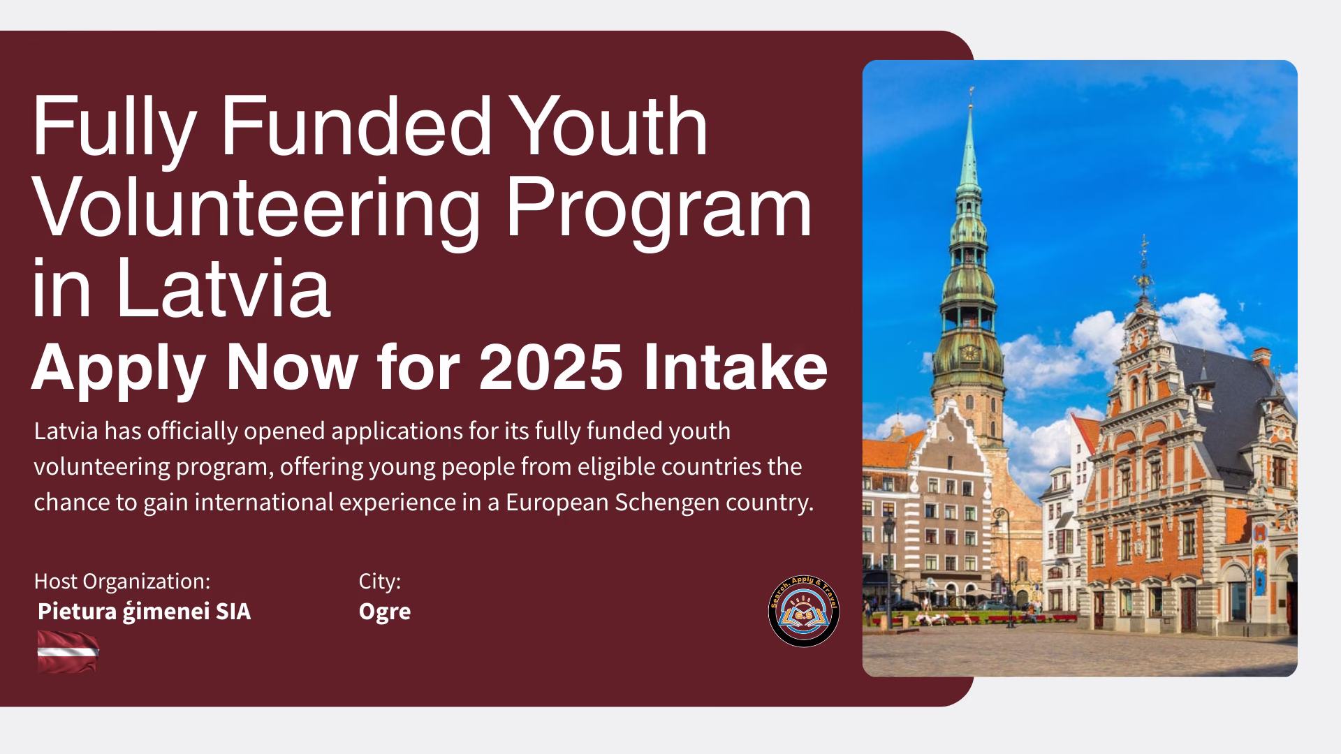 Latvia has officially opened applications for its fully funded youth volunteering program, offering young people from eligible countries the chance to gain international experience in a European Schengen country. This unique opportunity provides full travel funding, Schengen visa support, monthly financial allowance, free accommodation, and daily meal support.