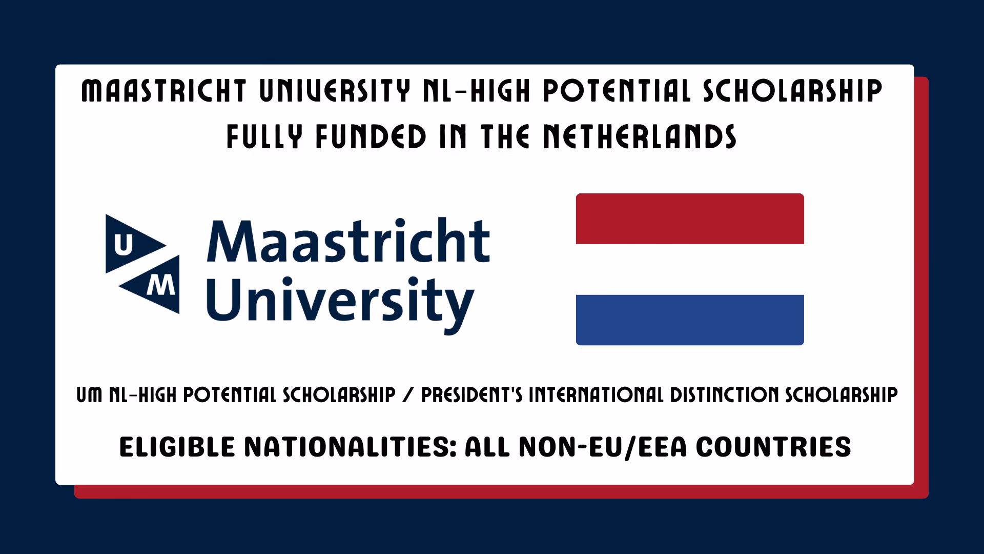 The Maastricht University NL-High Potential Scholarship is one of the most prestigious fully funded scholarships in the Netherlands for outstanding international students. Each year, Maastricht University offers 48 highly competitive scholarships worth €30,000 annually. Out of these, 24 awards are dedicated to exceptionally talented non-EU international students who wish to pursue a Master’s degree program at Maastricht University.