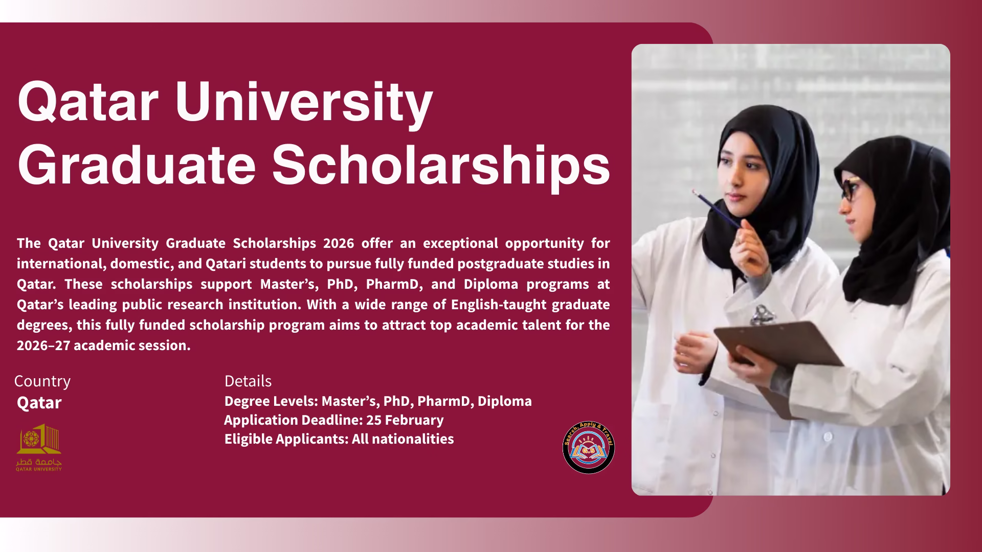 The Qatar University Graduate Scholarships 2026 offer an exceptional opportunity for international, domestic, and Qatari students to pursue fully funded postgraduate studies in Qatar. These scholarships support Master’s, PhD, PharmD, and Diploma programs at Qatar’s leading public research institution. With a wide range of English-taught graduate degrees, this fully funded scholarship program aims to attract top academic talent for the 2026–27 academic session.
