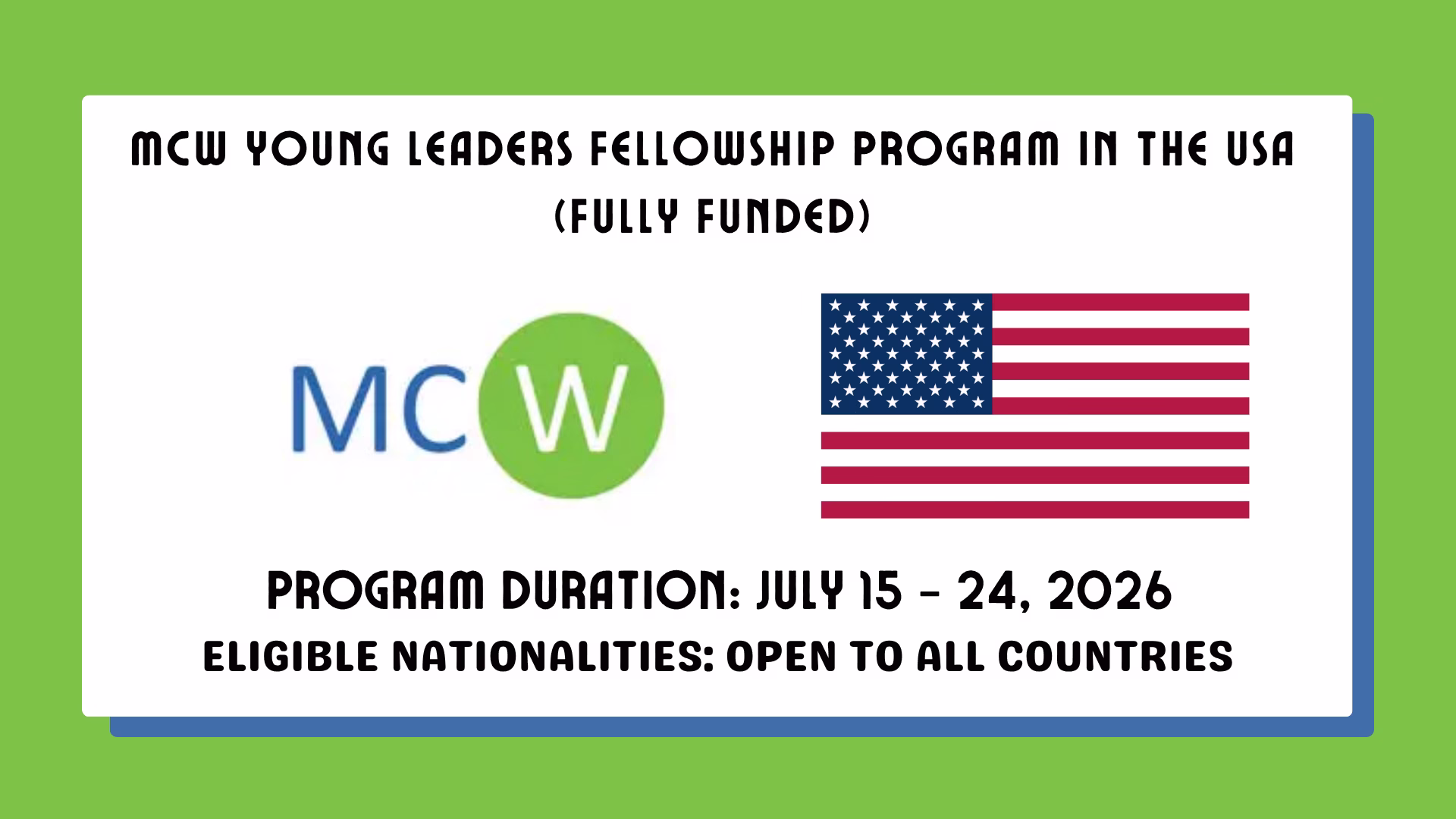 The MCW Young Leaders Fellowship 2026 in the USA is a fully funded international youth leadership program that offers hands-on learning, mentorship, and the opportunity to lead impactful community projects. It provides complete financial support, professional development, and global networking opportunities for young changemakers eager to make a difference in education, health, and economic empowerment.